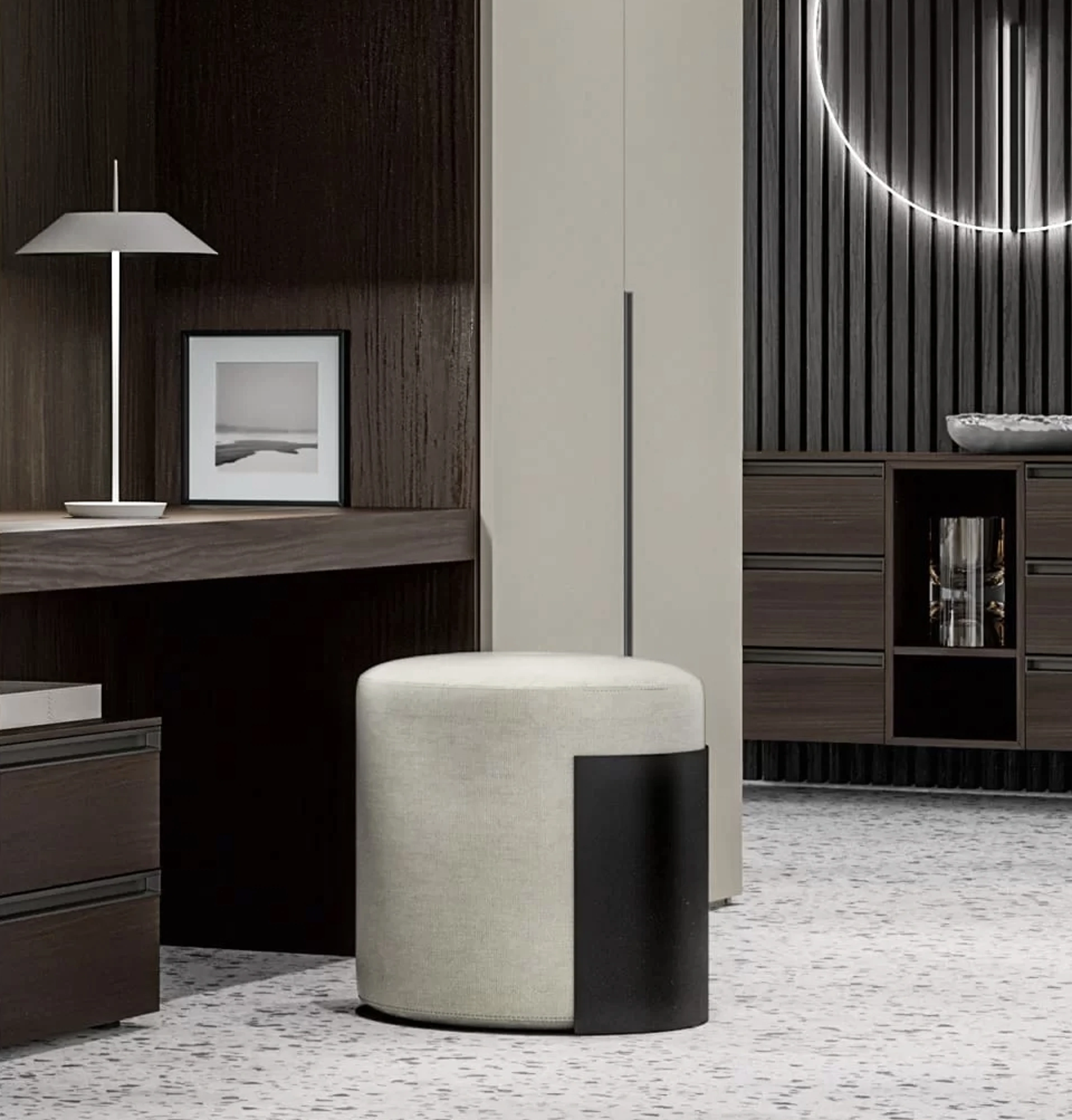 Il Pouf Bellini, un elemento distintivo della collezione Homy di SantaLucia, è stato ingegnerizzato per garantire massima flessibilità e integrazione stilistica. La sua solida struttura, realizzata in metallo, è il fondamento di un design essenziale e duraturo. Questo pouf è disponibile in due varianti geometriche: una configurazione rotonda, con un diametro di 51 cm e un'altezza di 52,3 cm, e una versione ovale, che presenta una larghezza di 110 cm, una profondità di 51 cm e un'altezza di 52,3 cm, offrendo soluzioni adattabili a diverse esigenze di spazio. Le opzioni di personalizzazione includono una finitura nera per la struttura metallica e un'ampia gamma di rivestimenti in tessuto (come Bari, Milano, Roma, Venezia, Genova, Napoli) o in ecopelle (London), consentendo una personalizzazione estetica avanzata. Questo elemento d'arredo è progettato per offrire massima modularità e personalizzazione, caratteristiche distintive delle soluzioni di design avanzato firmate SantaLucia.