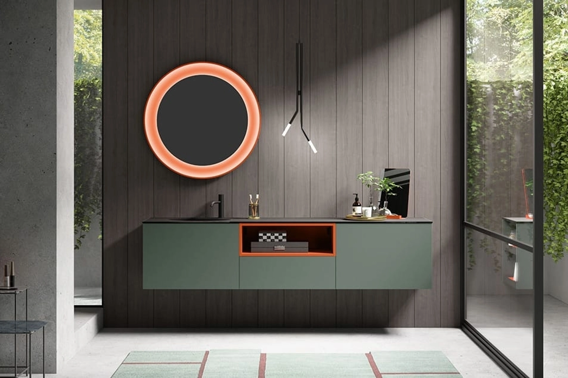 Arreda la stanza del benessere moderno perfettamente con Cartabianca 00, mobili bagno sospesi e oggetti in laccato opaco di Cerasa.