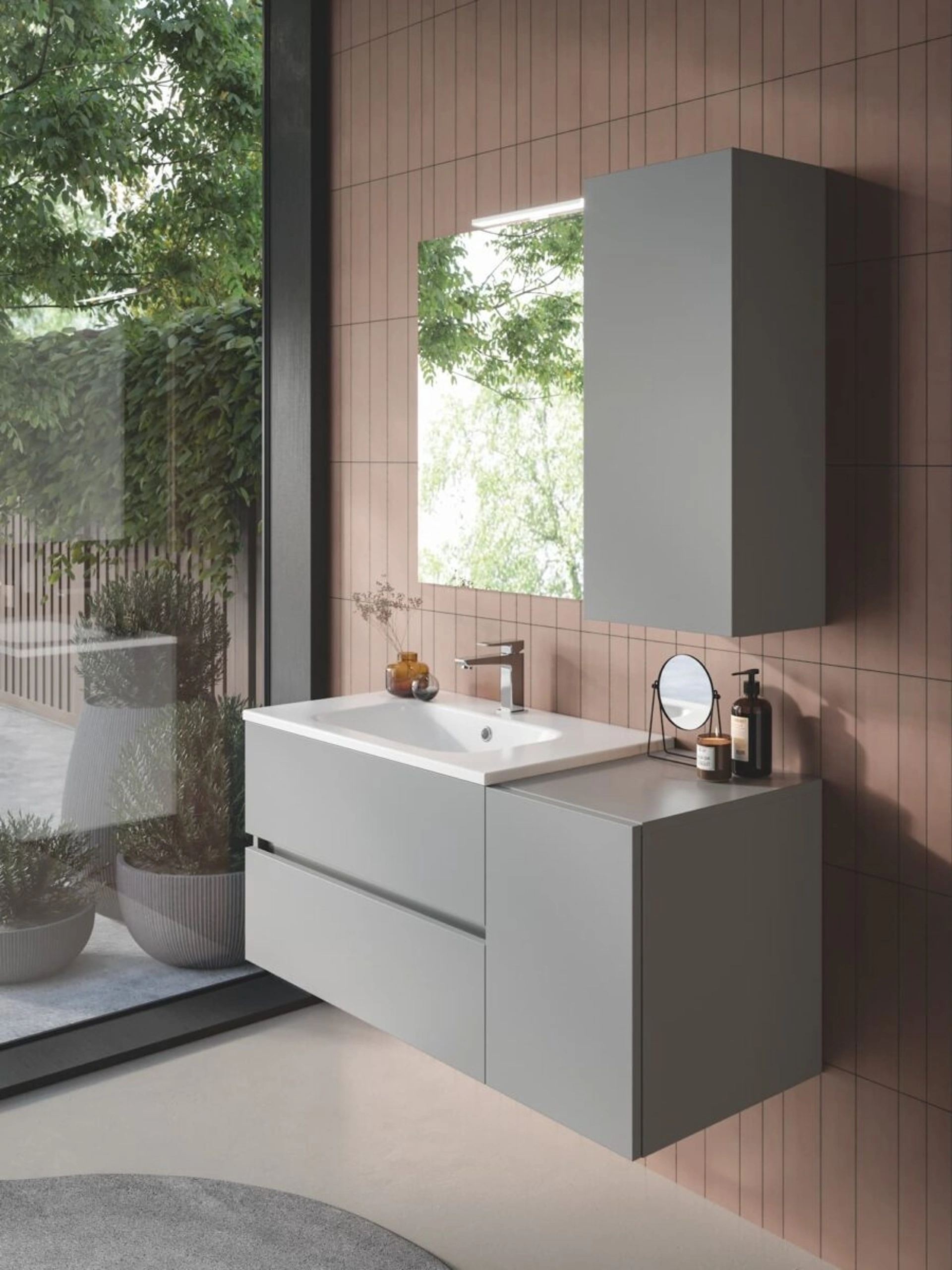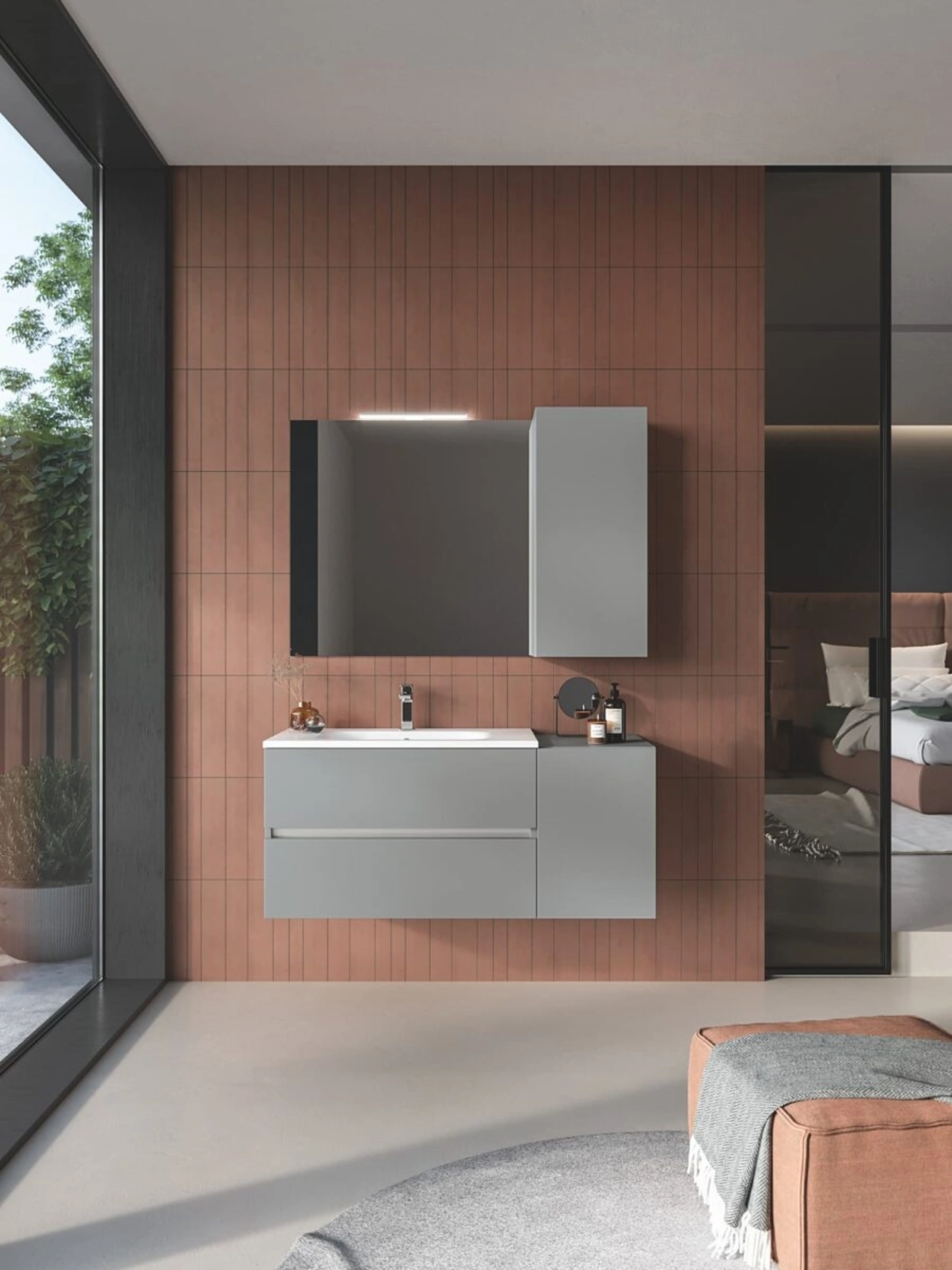 Arreda la stanza del benessere moderno alla perfezione con Fast 02, mobili bagno sospesi e accessori in laccato opaco di RCR.