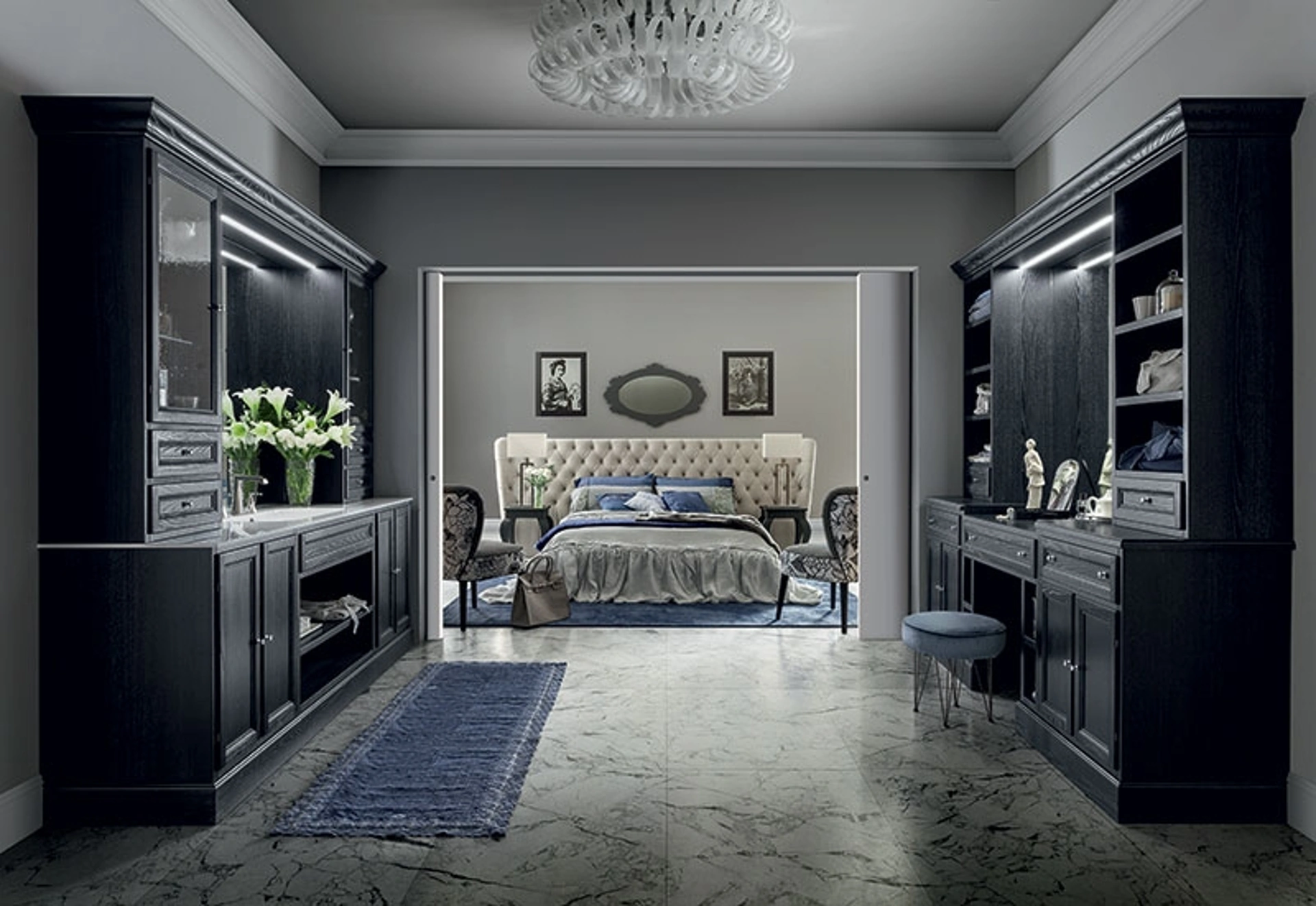 | Materiale: | Frassino laccato decapè Silver, Marmo lucido Nero Marquinia, Ceramica Idea |