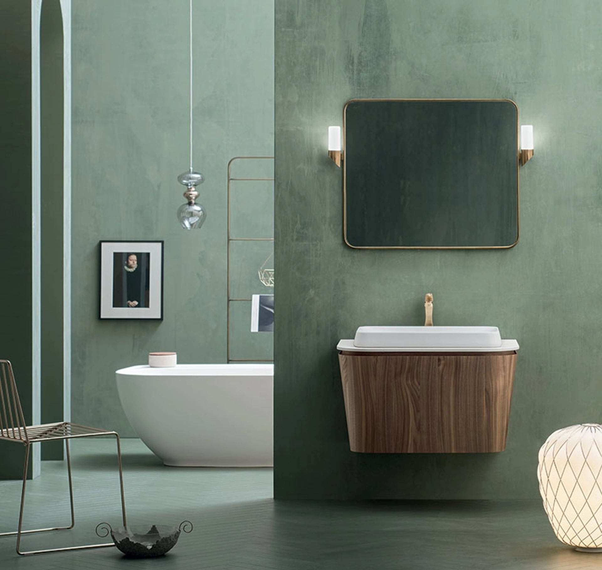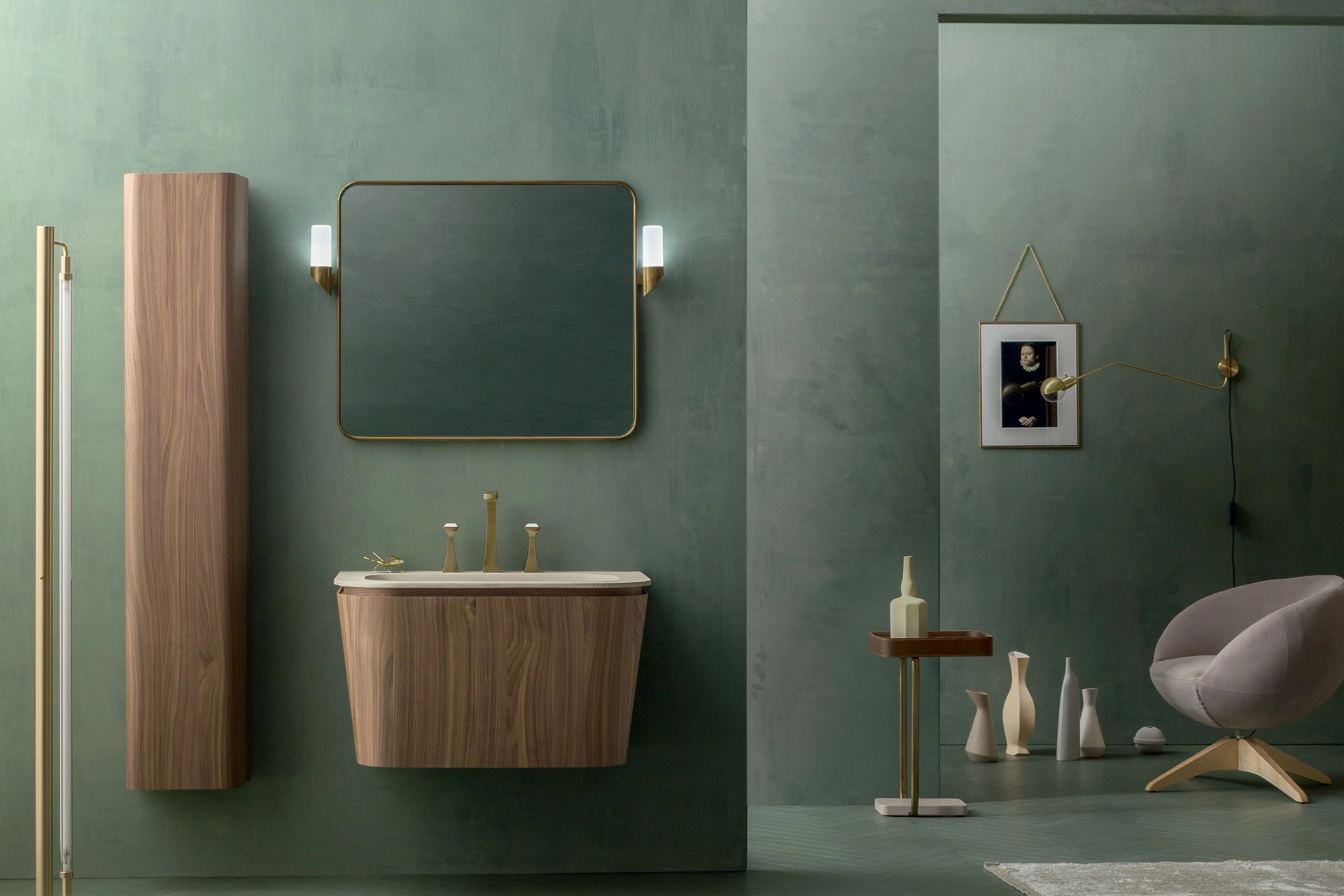 Il mobile da bagno Mobile da Bagno Suede 02, elemento distintivo della collezione Cerasa, esprime un design raffinato con forme sinuose e linee curve, che conferiscono un'estetica avvolgente. Questa unità lavabo sospesa è dotata di una base conica in pregiato Legno di Noce Canaletto, completata da un lavabo Evam in Ecomalta® finitura Talco e vasca integrata. La funzionalità è ottimizzata da un ampio cassetto con ripiani interni. I dettagli come lo specchio e la lampada, realizzati in Metallo bronzato lucido, richiamano l'eleganza dello stile Art Decò degli anni '20. Questo arredo rappresenta l'apice della ricerca estetica e dell'ingegneria costruttiva, garantendo soluzioni innovative e performanti per l'ambiente bagno contemporaneo.