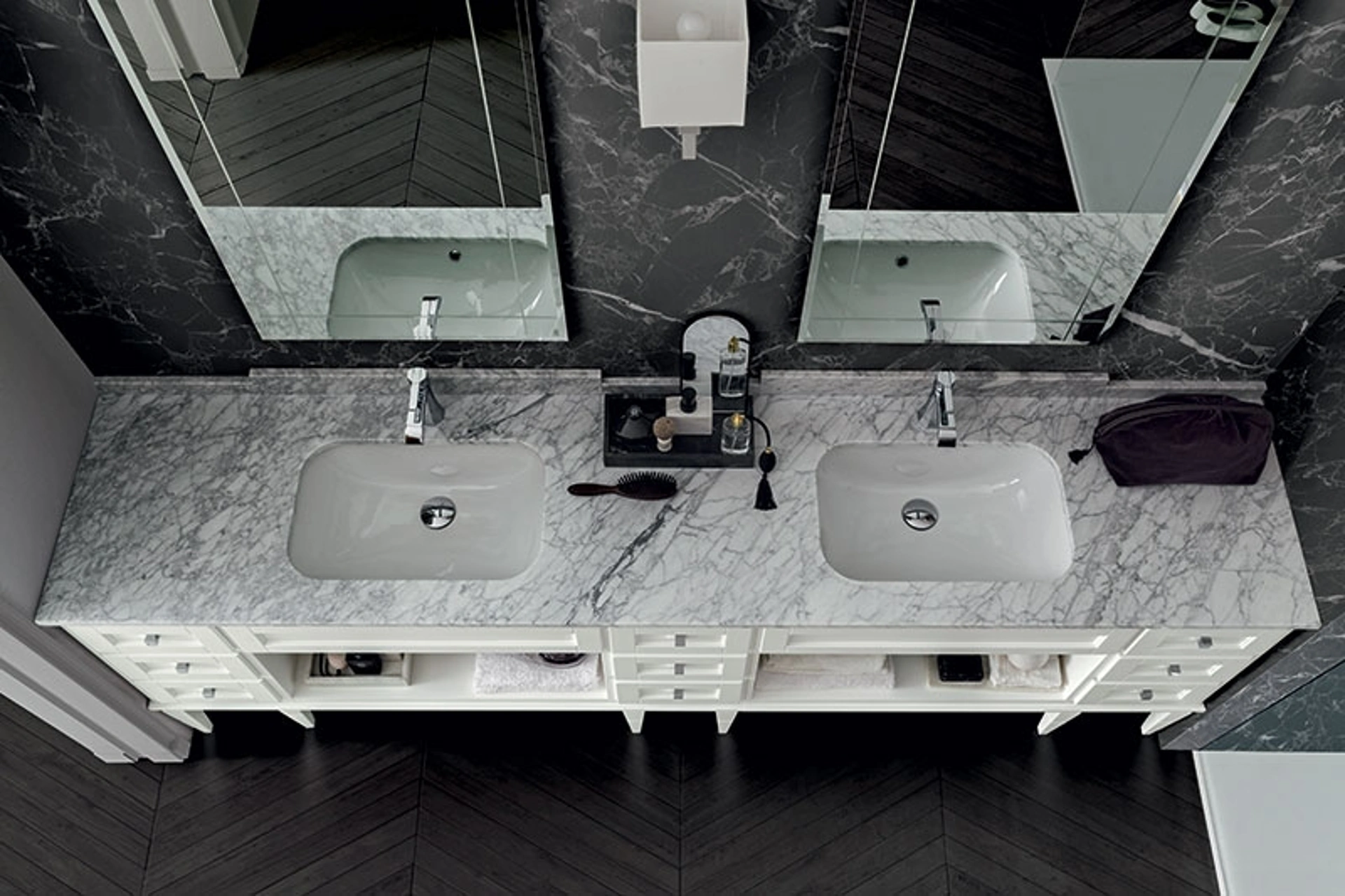 La collezione York 01 di Cerasa si distingue per le sue soluzioni d'arredo, improntate a un design classico e una raffinata estetica. Caratterizzata da un'elevata versatilità, offre una componibilità modulare e una flessibilità progettuale, consentendo di adattare tipologie di ante, profondità e altezze diverse. L'integrazione di accessori esclusivi amplifica le possibilità di personalizzazione e funzionalità. Il suo concept progettuale si estende con efficacia anche alle zone notte e living, fornendo soluzioni d'arredo e contenitive che ottimizzano gli spazi. Un esempio concreto di configurazione include un mobile bagno con finitura laccata in tinta unita Bianco, abbinato a un piano in Marmo Bianco di Carrara e un doppio lavabo sottopiano Nettuno, sottolineando la qualità dei materiali impiegati. L'attenta selezione dei materiali e le finiture di pregio garantiscono resistenza e un'estetica duratura, offrendo molteplici opzioni per armonizzarsi con ogni stile.