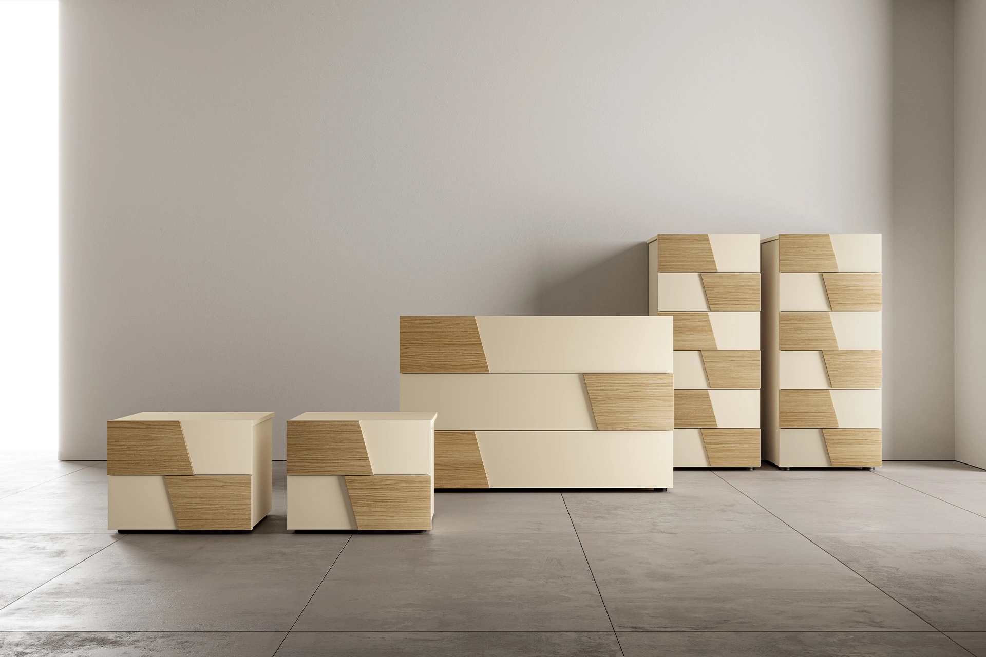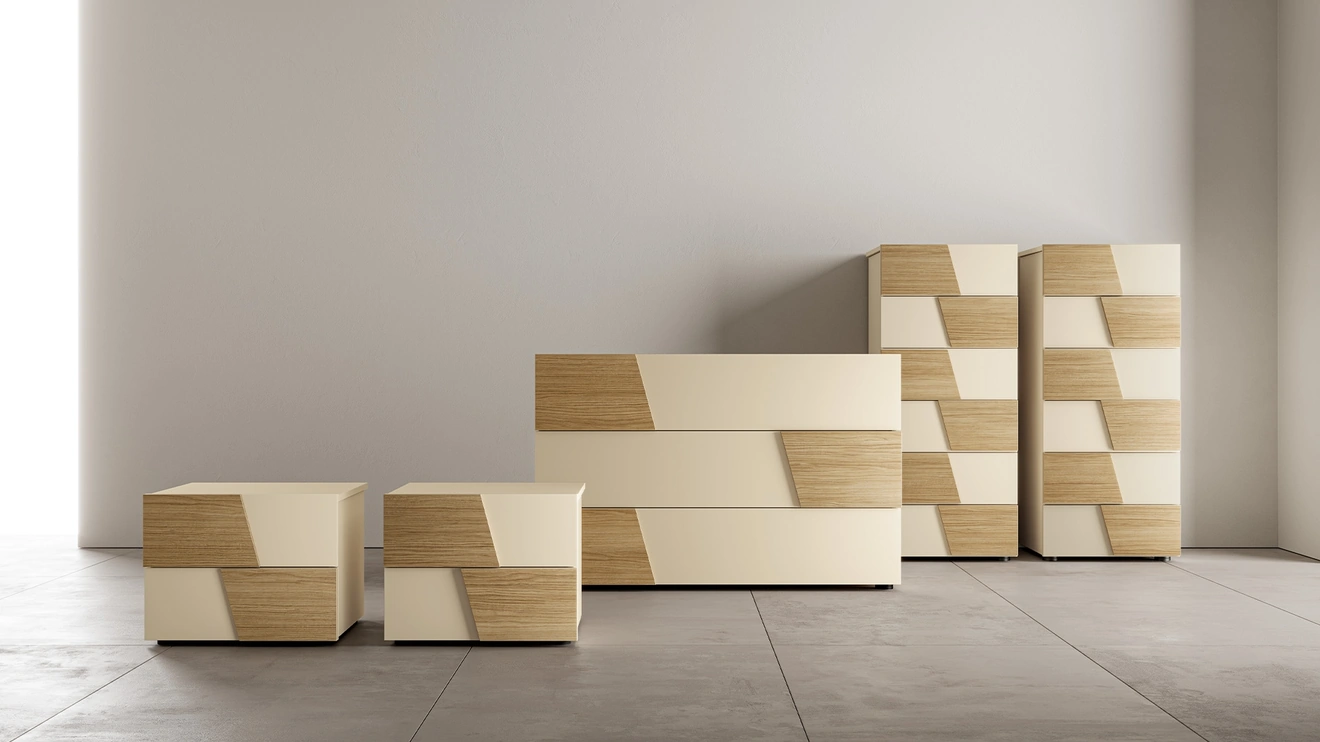 Il Gruppo Notte Club di SantaLucia si distingue per l'ingegneria del design, caratterizzata da inserti geometrici che ne valorizzano l'estetica complessiva. La composizione propone forme asimmetriche e un'armoniosa alternanza di finiture, dove superfici levigate e opache in tonalità chiare e neutre si fondono con essenze calde. Questo crea un dinamismo visivo tra pieni e vuoti, giochi di luce e ombre, conferendo profondità all'ambiente. Il sistema offre una vasta gamma di personalizzazioni cromatiche e materiche, includendo essenze come Matwood White, Silk, Grey, Honey, colori Eco quali Bianco, Avorio, Limo, Pepe, Muschio, Corallo, e texture materiche come Clay Light e Clay Dark. La progettazione attenta e la selezione di materiali di alta qualità garantiscono una durabilità eccezionale e un'estetica raffinata, rendendo questo complemento d'arredo un investimento di valore duraturo nel tempo.