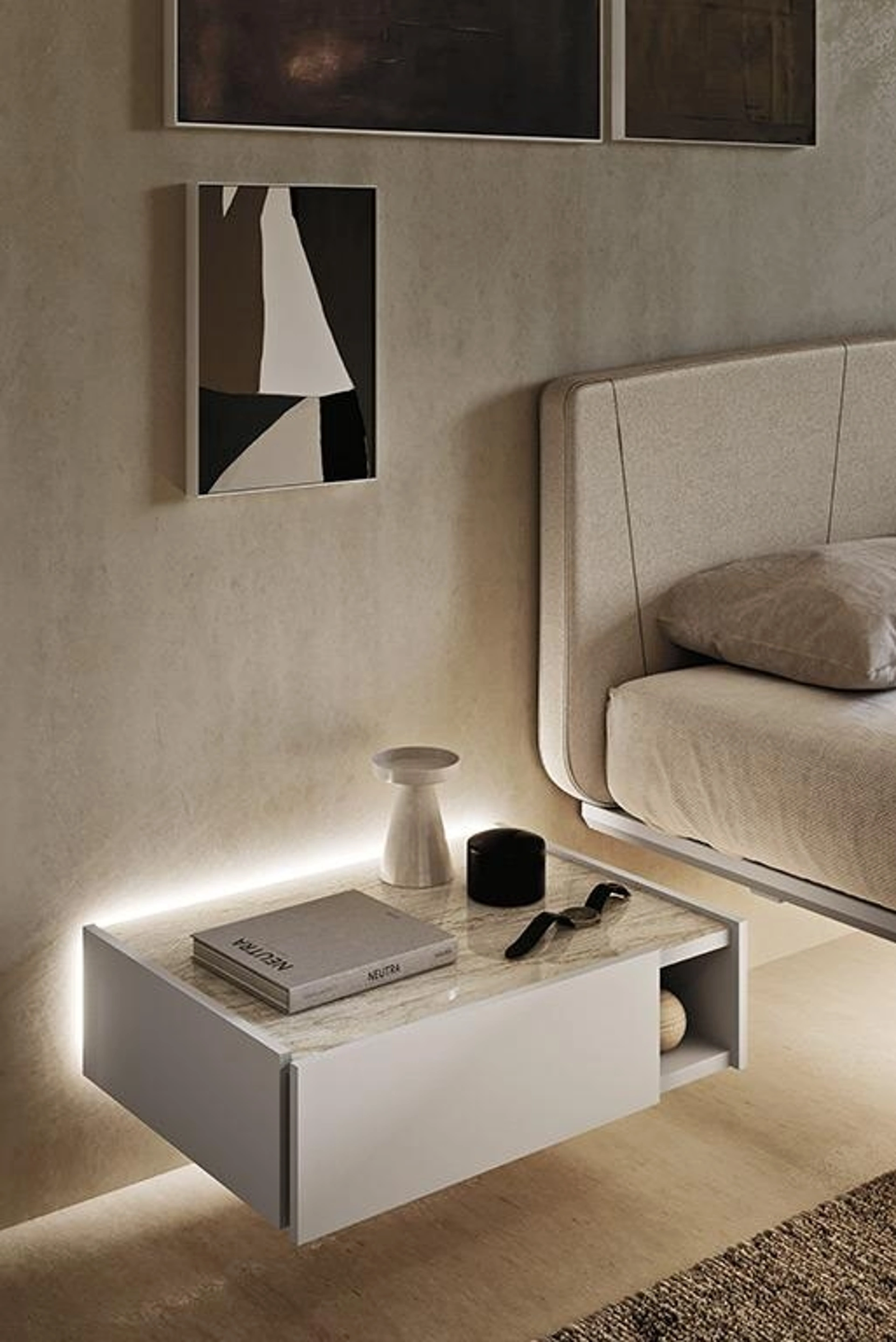 Vuoi ammobiliare la camera da letto con Comodini e mobili con cassetti di Mobilgam? Ecco qui il modello Smart sospeso in laccato opaco per spazi moderni.