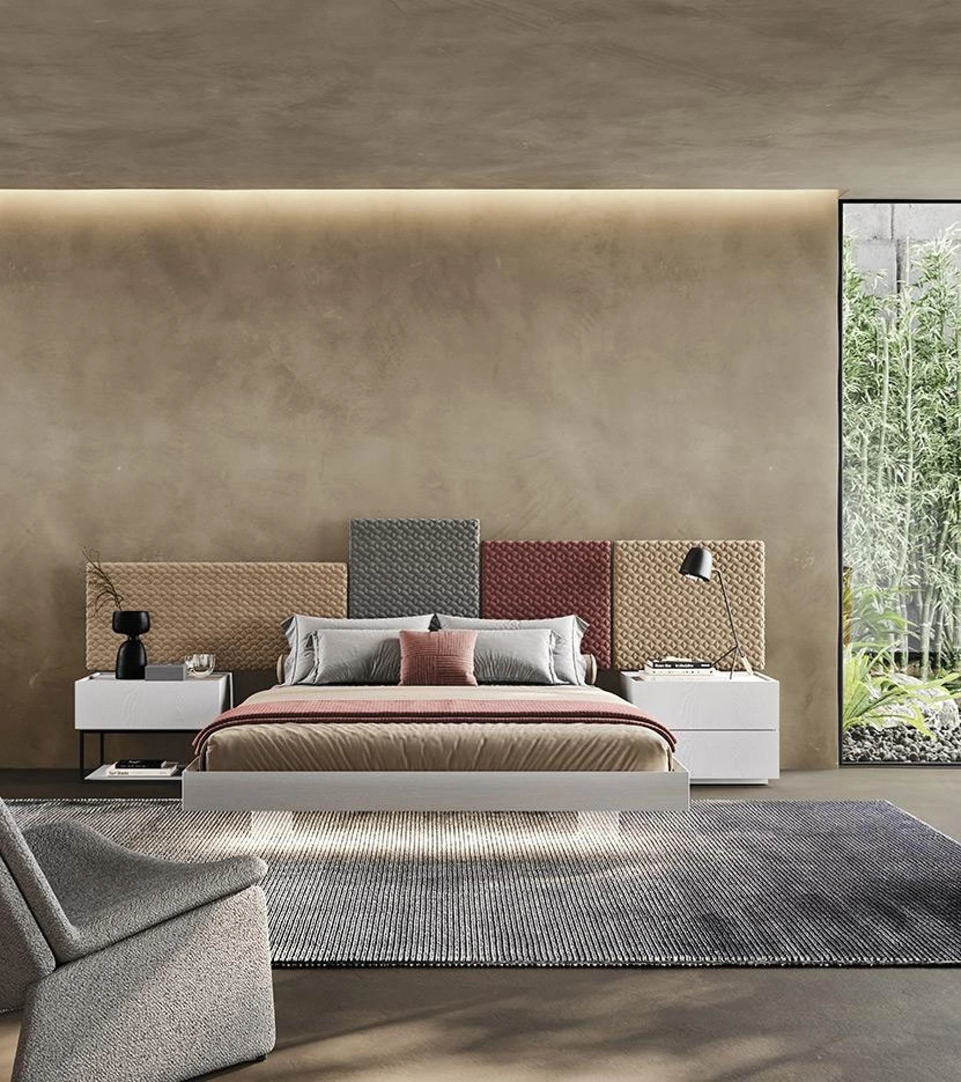 Vuoi ridefinire la zona notte? Ti presentiamo il letto in tessuto Tetris di Mobilgam per spazi moderni.