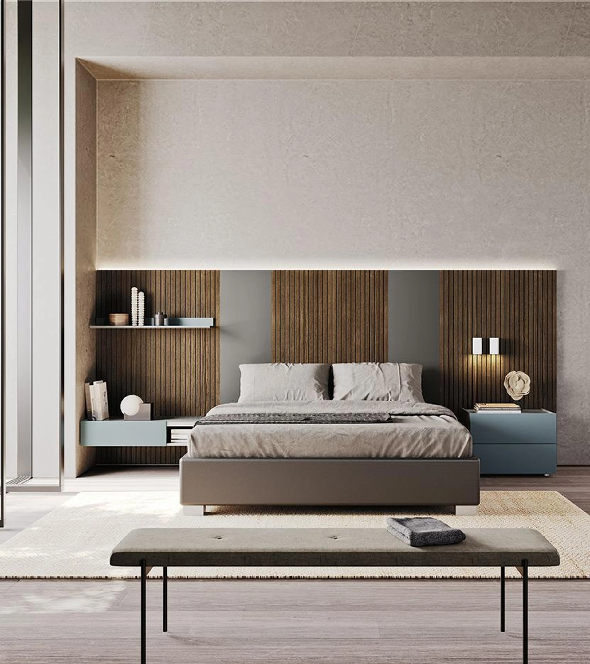 Se vuoi letti matrimoniali con testiera, ti presentiamo il modello Sistema Sipario in legno per completare la camera da letto.