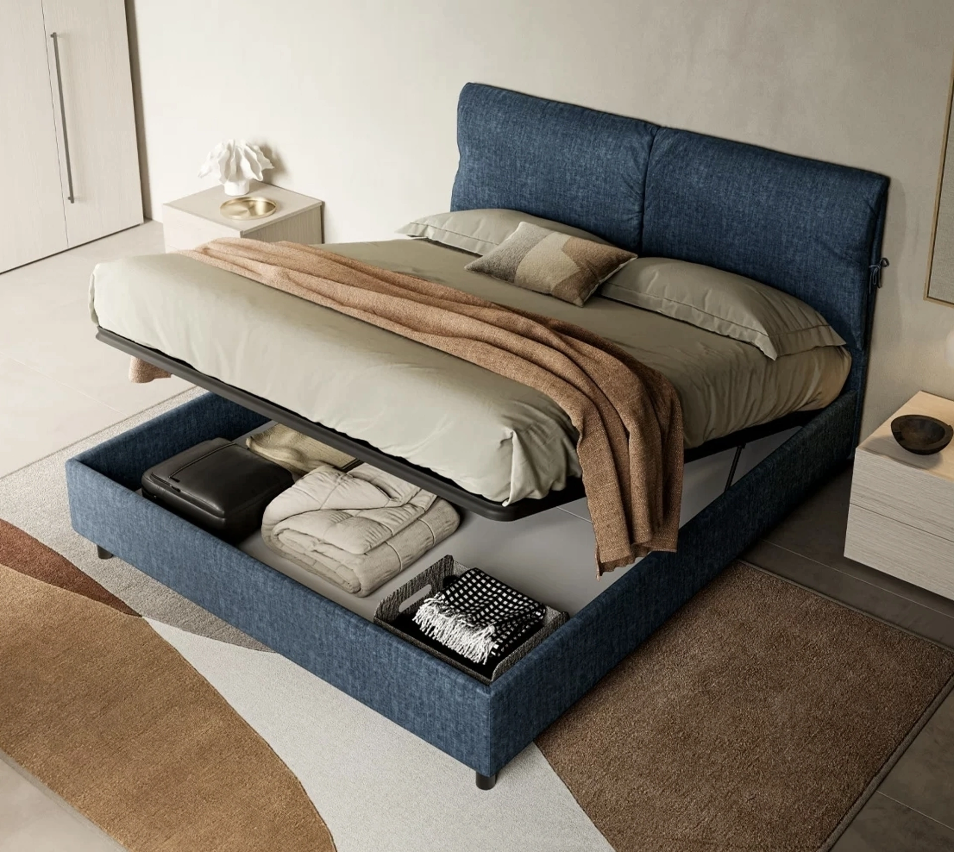 Il letto Taku in tessuto, tra i modelli con contenitore matrimoniali moderni di SantaLucia, è pensato per garantirti il relax totale.