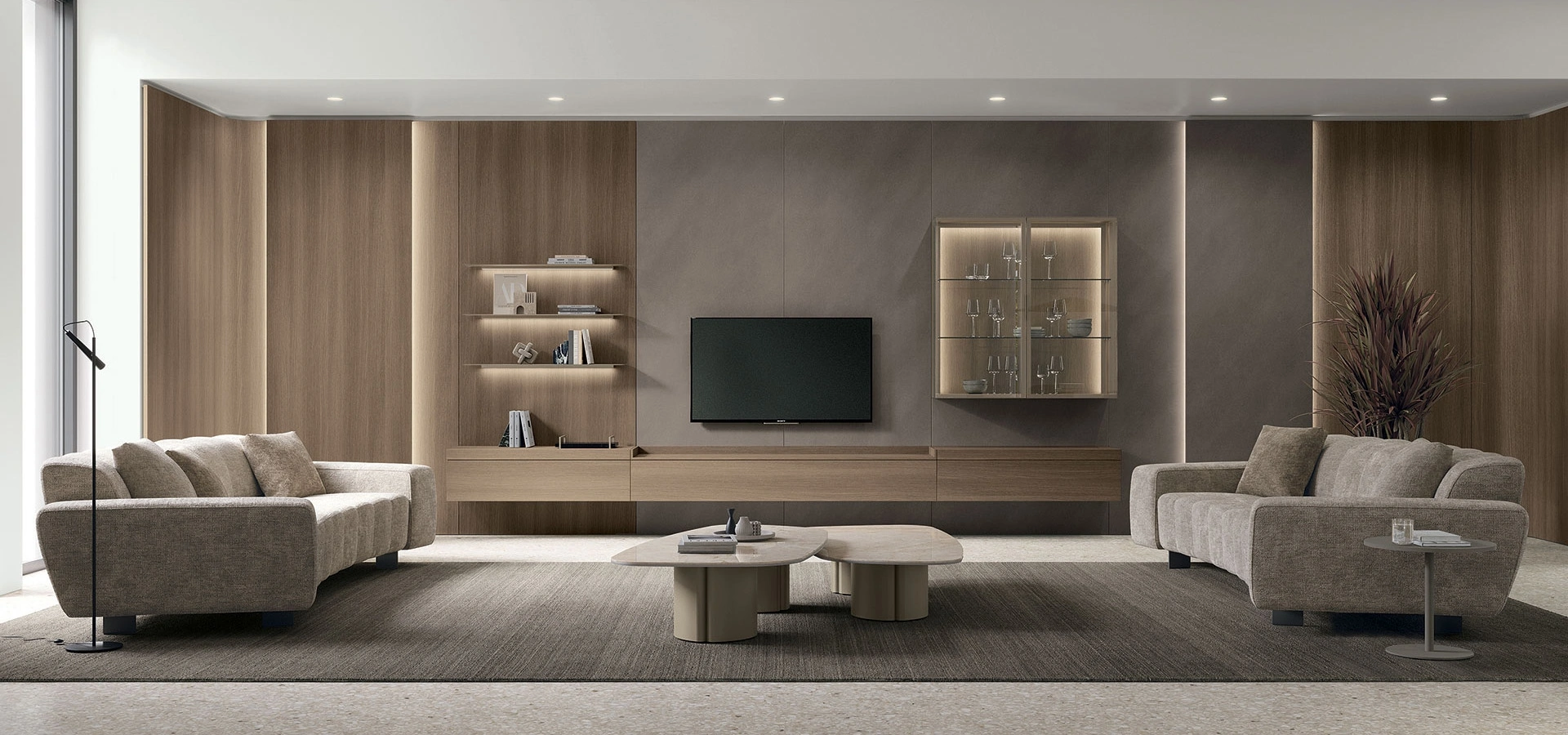 La parete attrezzata Atlante UNIT AT144 offre un'elevata modularità con basi, pensili, colonne, moduli TV, mensole e ripiani a giorno. È configurabile con ante battenti, a ribalta o push-pull per adattarsi perfettamente al tuo spazio.