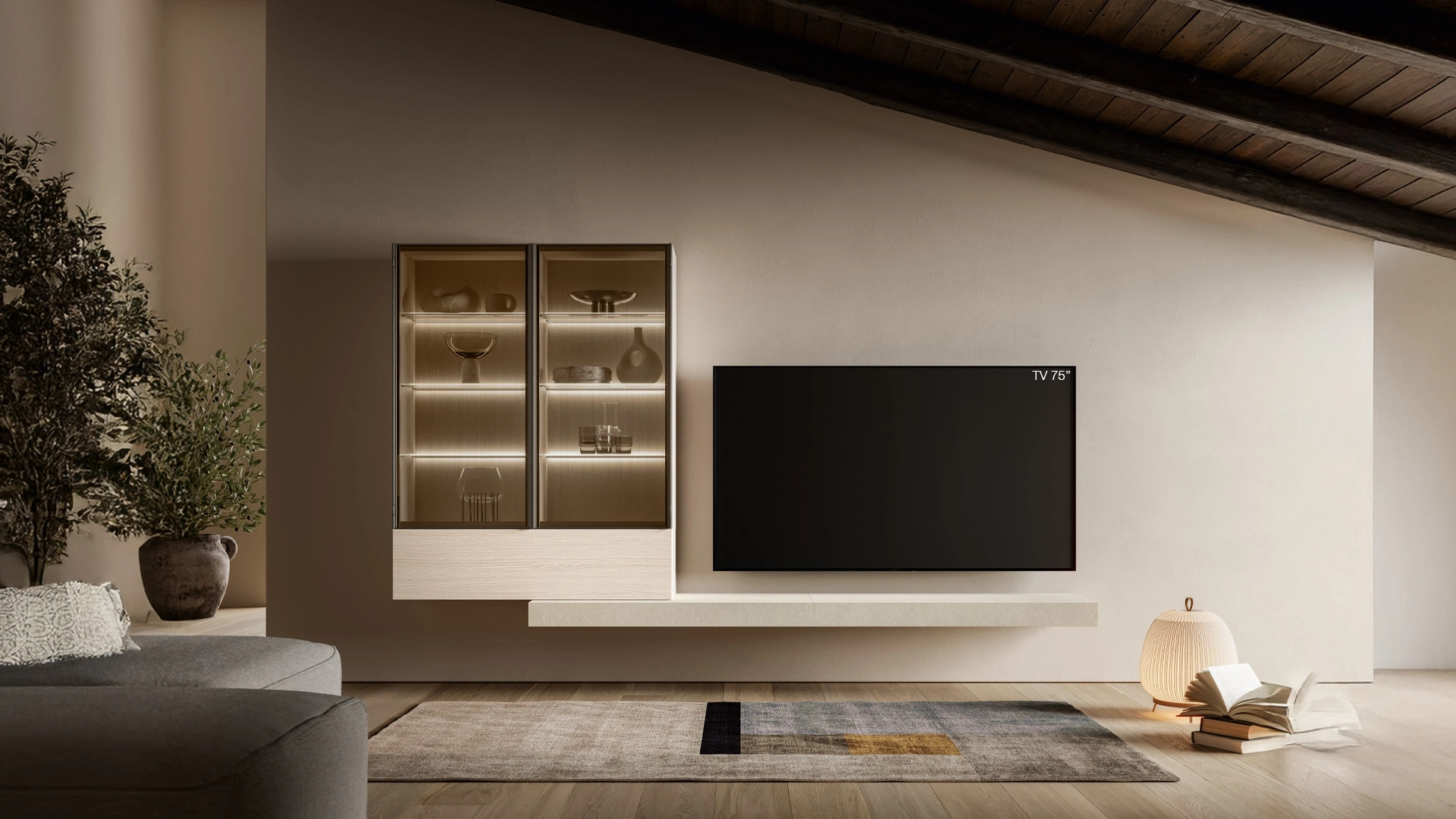 La composizione Pratico PTG414, parte integrante della collezione Pratico di SantaLucia, si configura come una soluzione d'arredo tecnicamente avanzata per il soggiorno contemporaneo. Il suo design è meticolosamente studiato per ottimizzare gli spazi e la funzionalità, integrando con precisione mensole del sistema Cento, ideali come superfici d'appoggio, un pensile a ribalta dal meccanismo fluido e vetrinette eleganti. Ogni componente è ingegnerizzato per assicurare un'elevata praticità d'uso e una robustezza strutturale, riflettendo un'estetica curata e una grande attenzione ai dettagli costruttivi. Esplora le caratteristiche tecniche e l'innovazione funzionale di questo arredo, progettato per eccellere in ogni ambiente moderno.