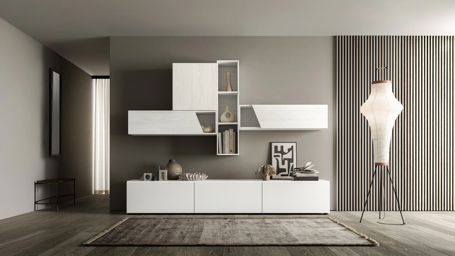 La composizione Pratico PTG425, esemplare della serie Pratico di SantaLucia, incarna la modernità attraverso un design intrinsecamente geometrico. Questa parete attrezzata si distingue per l'armoniosa fusione di linee pulite e segmenti asimmetrici, come le innovative ante Sbieko, che conferiscono all'ambiente living un'estetica visivamente stimolante e contemporanea. La sua architettura è studiata per garantire massima funzionalità e un impatto visivo deciso, ideale per contesti abitativi dinamici. Ogni componente è selezionato per le sue proprietà meccaniche ed estetiche, garantendo una performance superiore e una lunga vita utile del prodotto.