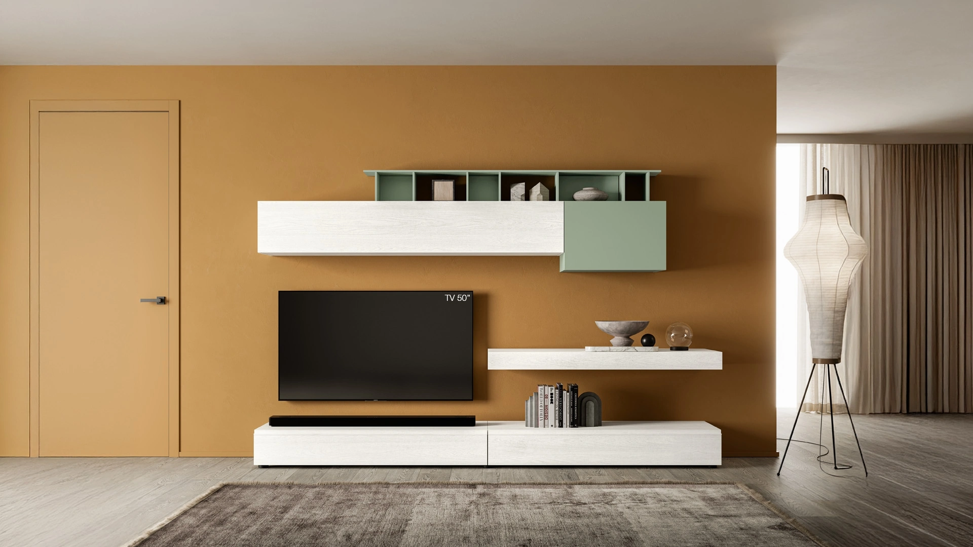 La parete attrezzata Pratico PTG444 è disponibile in diverse finiture coordinate. Presso Mobili Riccelli S.r.l. è possibile visionare campioni di materiali e finiture per scegliere la soluzione più adatta.