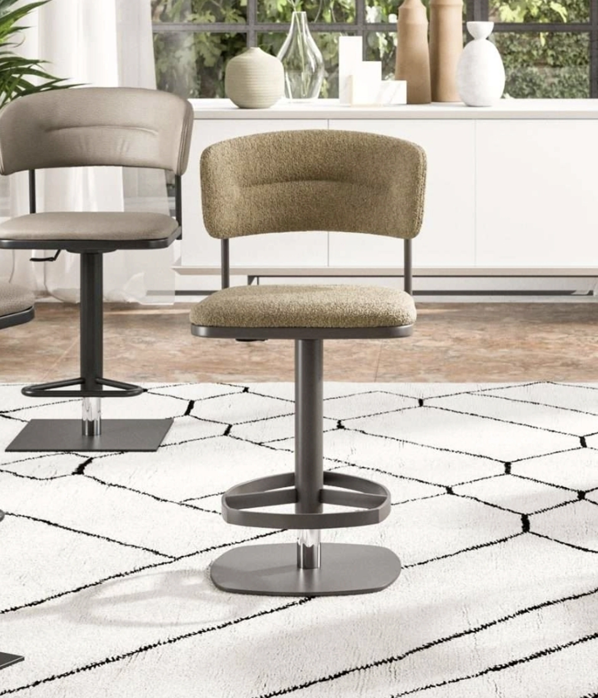 Sebbene i dettagli specifici non siano forniti, gli sgabelli di questa categoria solitamente presentano una struttura in metallo o legno e possono avere una seduta imbottita o rigida, a seconda del modello.