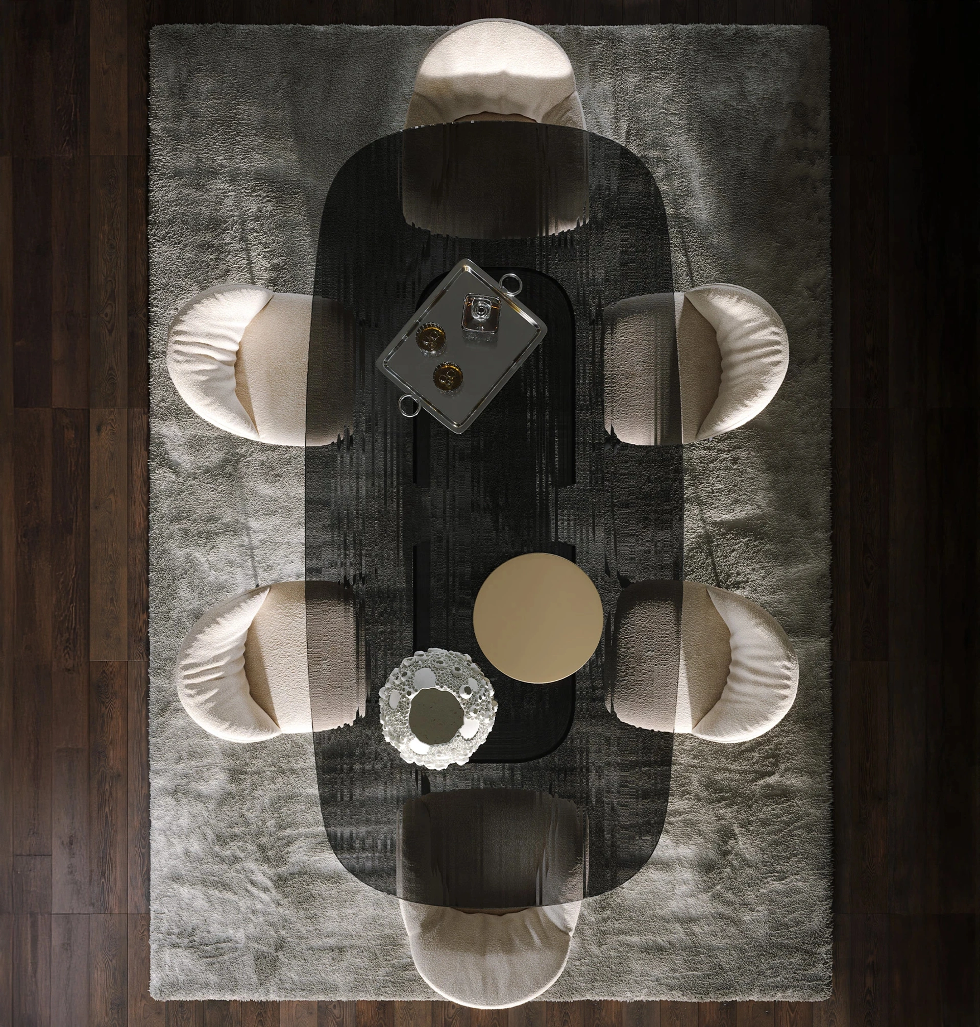 Il tavolo Millerighe di Tonin Casa incarna una fusione ingegneristica di robustezza strutturale e leggerezza estetica. La sua peculiarità risiede nella struttura in vetro fuso con lavorazione a righe, concepita per modulare l'interazione con la luce ambientale e lo spazio circostante in modo dinamico. Le basi, caratterizzate da un design simmetrico e curve raffinate, offrono un supporto stabile e visivamente armonioso. Su queste poggia un piano dalla distintiva forma a botte. Questa configurazione enfatizza non solo la intrinseca solidità del materiale vetroso, ma anche la fluidità e l'eleganza complessiva del progetto. La finitura superficiale del vetro è studiata per generare un'intricata serie di riflessi, contribuendo a un'atmosfera di raffinata modernità in ogni contesto d'arredo. Questo elemento d'arredo rappresenta l'apice dell'innovazione nel design italiano, combinando materiali di eccellenza con una funzionalità impeccabile per un risultato di pregio.